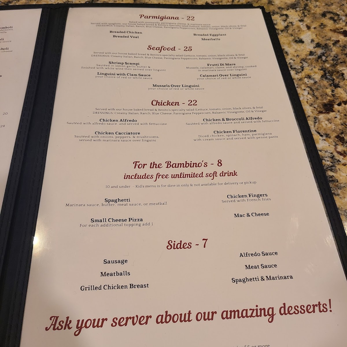 Finish your meal with their famed chocolate drizzled cannolis or a velvety cheesecake, ensuring your dining experience is as unforgettable as the friendly service. A visit to Benito's is not just a meal; it’s an invitation to indulge in Italian comfort food at its finest.